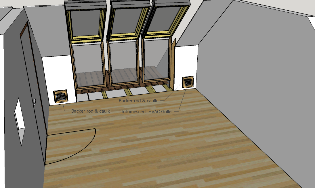 Here's how the silencers go through the knee walls into room 1. Backer rod and caulk to isolate the sleeves from the walls. The low mounting is very useful here as these will eventually be concealed behind speaker soffits. It will allow mains cable runs below the sleeves, and above it signal cable runs to other rooms. High performance intumescent grilles will be fitted to preserve the fire resistant qualities of the knee walls. Unfortunately these reduce the free area of the sleeve from 400cm2 to 225cm2. The datasheet is thorough though, and they are at least reassuringly quiet and have a very low static pressure at the air flow rates in use.