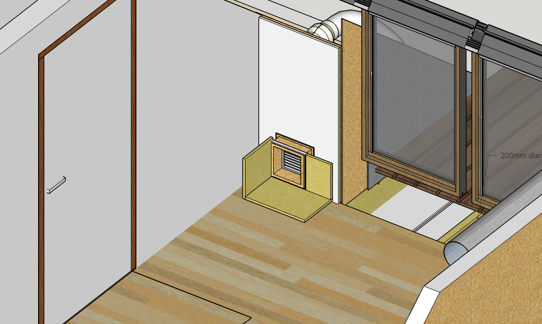 An MDF panel covers the face of the supply register. 150mm diameter acoustic flex duct is attached to a spigot on this panel. The 150mm flext duct eventually joins to a section of 200mm diameter flex about a metre long. From this supply air goes to the rear of the room. Cross sectional area of the 200mm duct is 314cm2, close to the ideal of 360cm2;