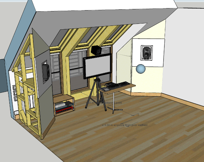 With the Genie clips and furring channel installed with just the original 12.5mm plasterboard layer, this is pretty much corrected. The door has been beefed up with ~41mm of MDF, almost doubling its mass and keeping it flush with the moved plasterboard. This means that first reflection point and soffit symmetry is within 4mm, not bad at all;