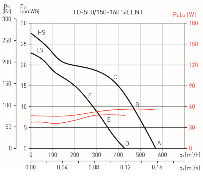 The best inline fan I've come across was suggested by (I think!) John Steel on this forum. It's a TD-Silent 500/150, and is one of the few that provide properly measured acoustic data. I've attached the datasheet, and here's the performance graph from it. If my static pressure estimate is accurate the fan will be suitable at the low speed (LS) setting. If I've underestimated static pressure there is some headroom there at the high speed setting.