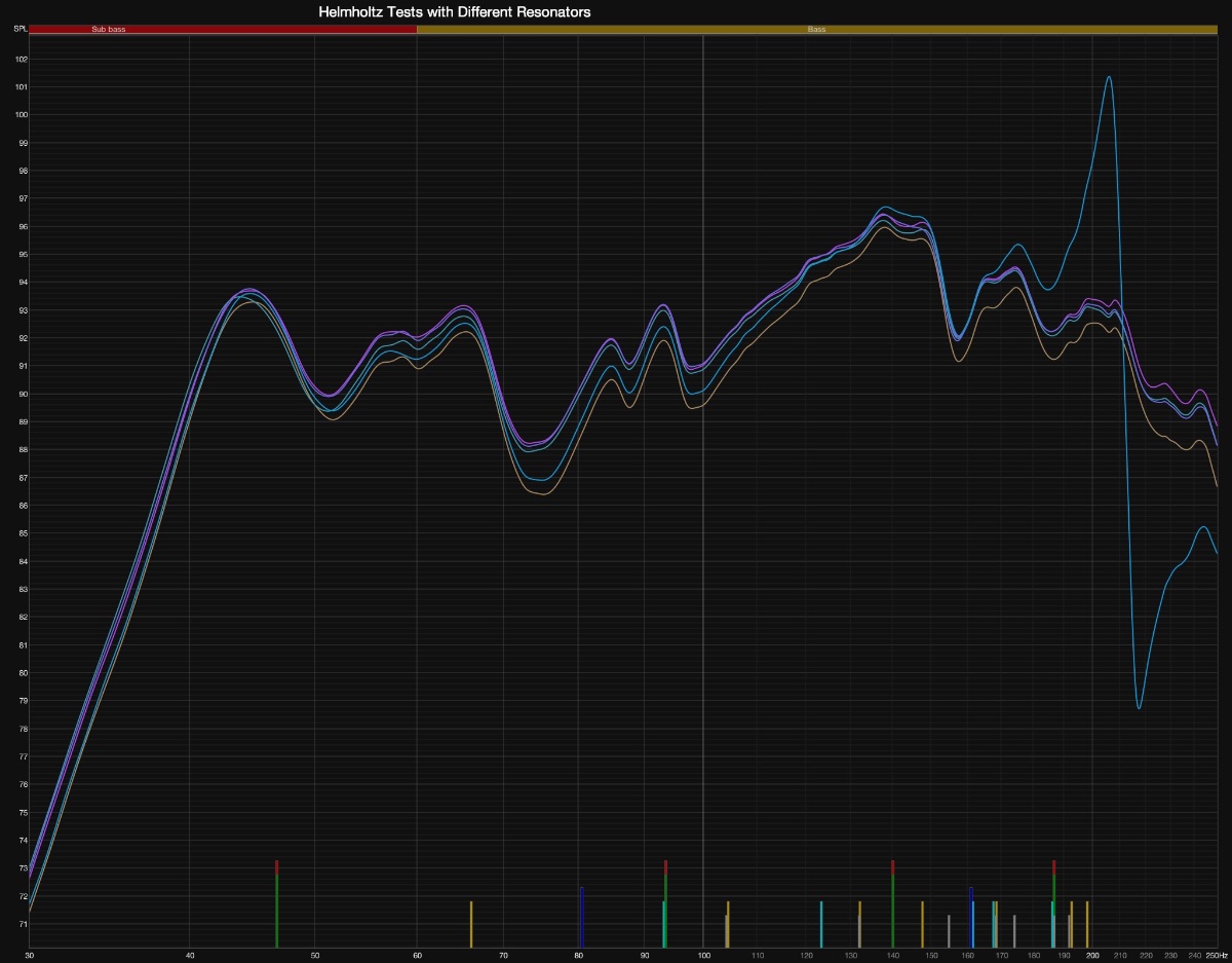 So all of the resonators have been demonstrated to resonate around the right frequency, either by the candle test (for the boxes) or simply by blowing on the mouth of the bottle. However, the low frequency resonators differ from the bottle in having no measurable effect on sound levels.