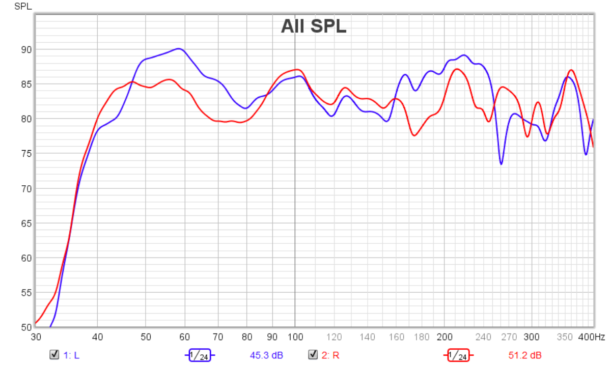 It's obvious in the overlaid waterfall plots too, the left speaker overpowers the right to a significant degree in the 50 - 80Hz region;
