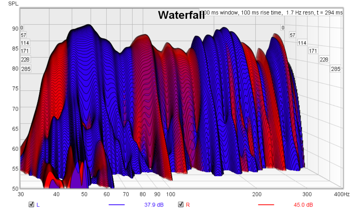 Yep. That's a pretty big difference, for sure! It would be informative to do some REW math operations on that, and get the difference between the left and right speakers, to see how bad it really is, in the frequency domain. Soffits will certainly help to iron that out!It's obvious in the overlaid waterfall plots too, the left speaker overpowers the right to a significant degree in the 50 - 80Hz region;