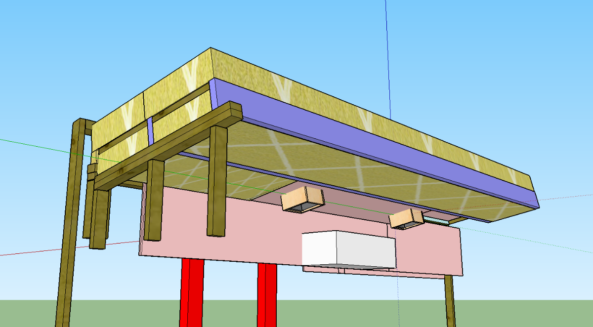 In the images below you can see how I’m dropping the hard inner (inside out) ceiling where the silencer sits – all of these are cut away views of the supply side silencers that are either side of the wall that separates my shed from my studio.