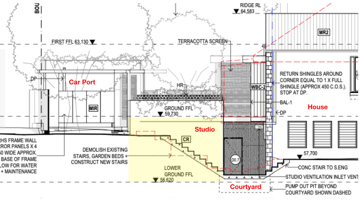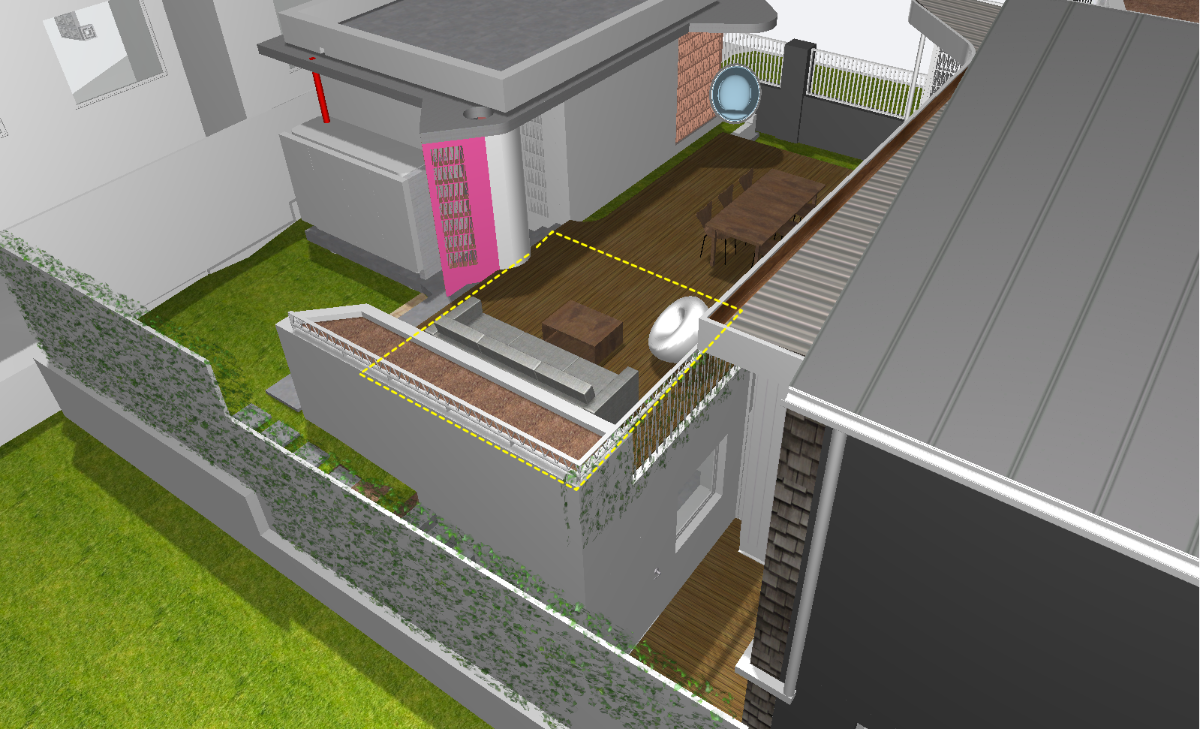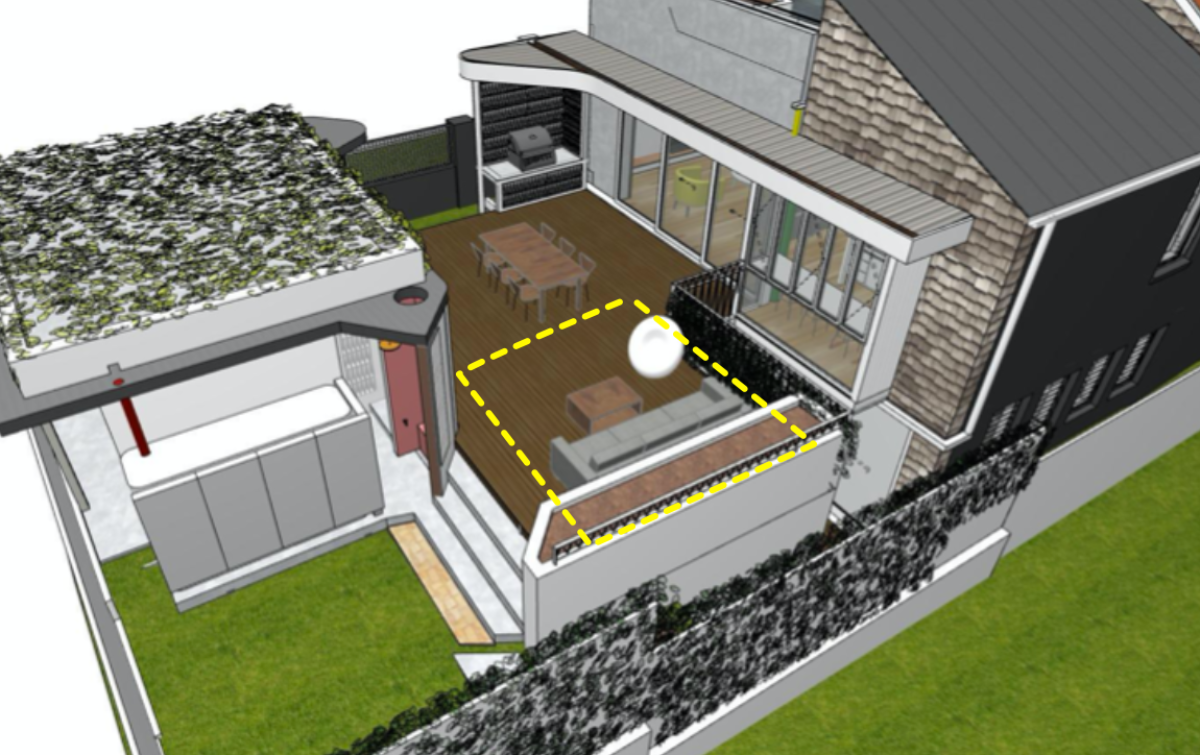 The drum room (shown dotted yellow) will be mostly hidden under new decking at rear of the house.