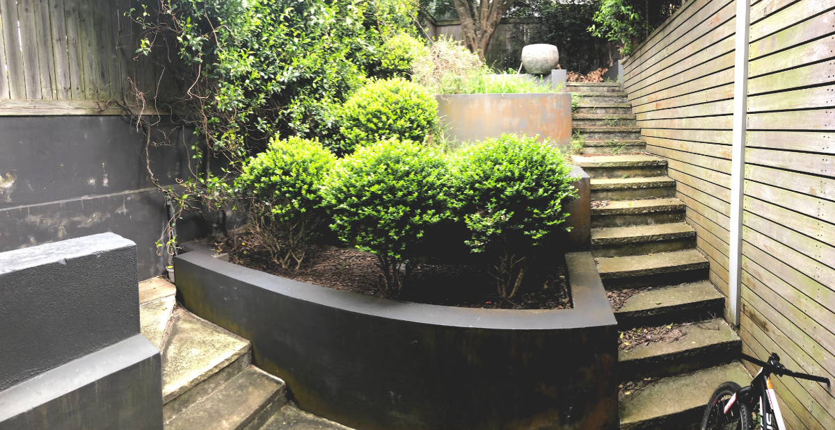 The room is partially built into soil on two sides, with a staircase on south side and a door and window (facing main house) on east side. Ground floor decking sits above the ceiling along with a new garden bed.