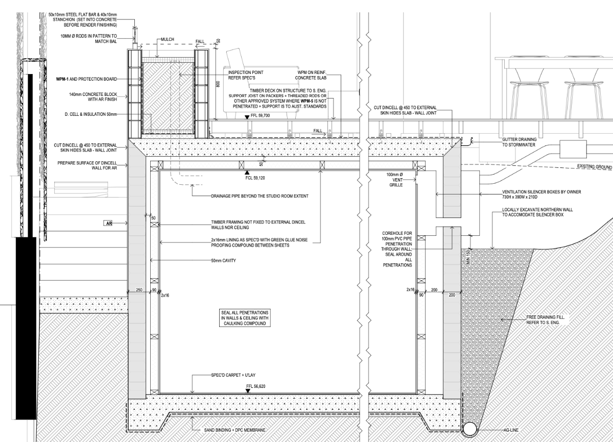 That, right there, is a really good thing that tells me your isolation goals are achievable. That's an excellent situation. With a bit of luck and careful HVAC design, you should be able to meet that goal, and perhaps exceed it.The room is partially built into soil on two sides, ... Floor is monolithic slab on grade. Outer walls are rendered 200mm Dincel (concrete with plastic formwork). Ceiling is poured 200mm concrete to match. This thickness of concrete is already required for the retaining walls