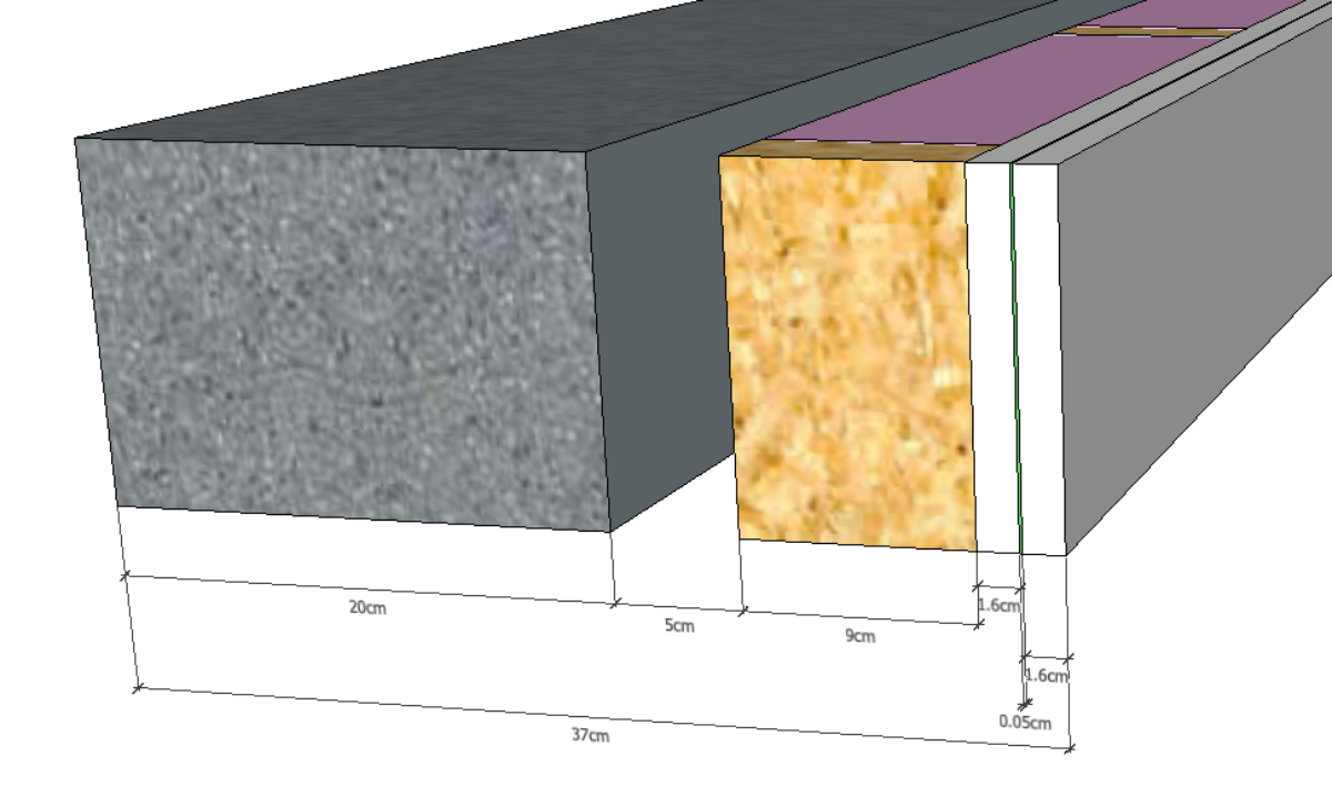 The northern wall cavity is wider (290mm) to accommodate the two internal boxes and the two outer boxes are attached to the external concrete wall.
