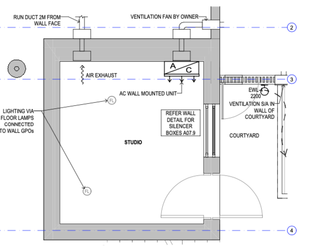 Supply air inlet is high on the courtyard wall, and exhaust outlet is under decking.