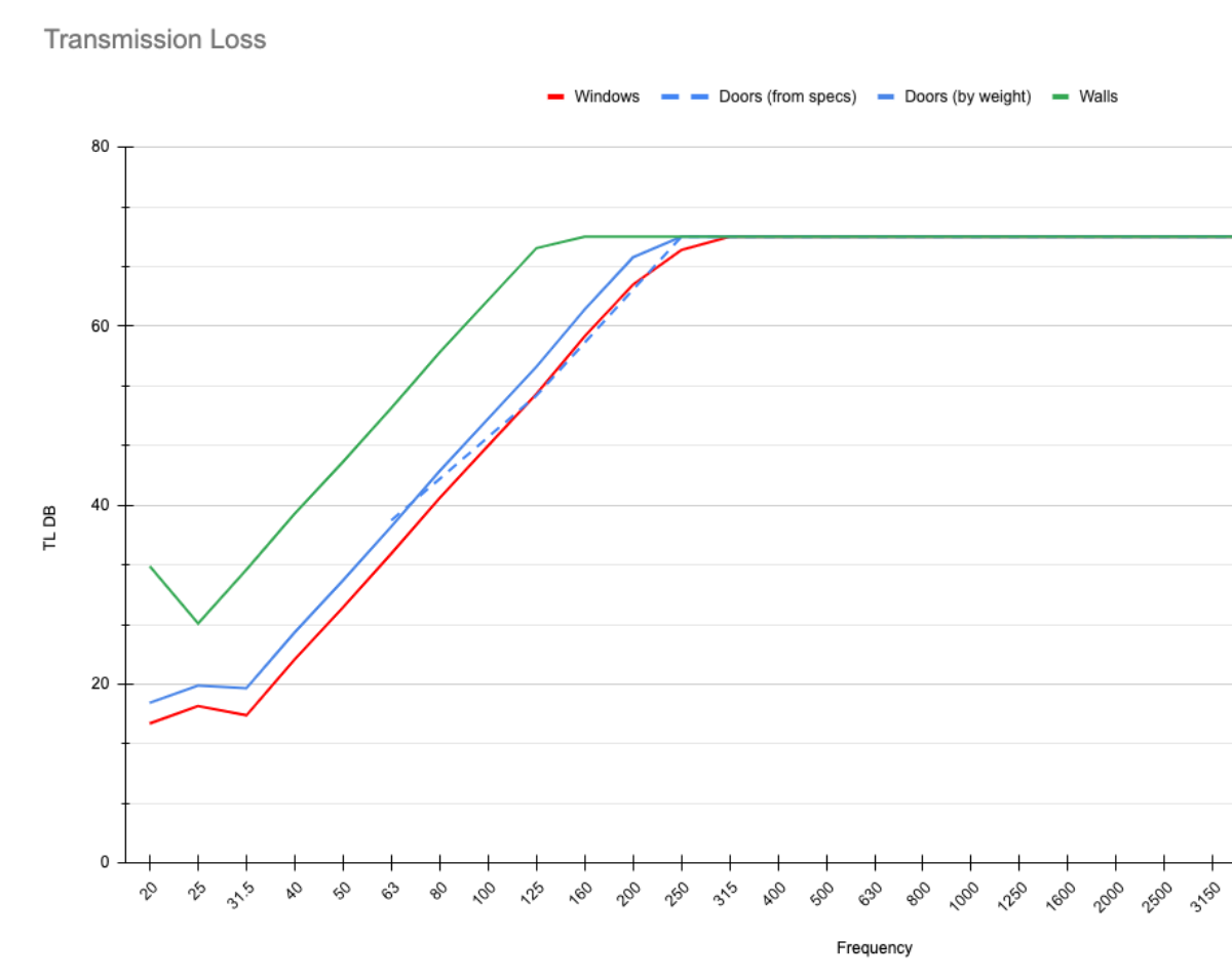 Well, I'd take that graph with a large pinch of salt! 70 dB of isolation at 125 Hz would be pretty darn amazing! Beyond amazing, it would be unbelievably incredible! And TL curves are pretty much never flat like that. Your goal of 55 dB is realistic: that graph is not.If I’ve put the right numbers into Gregwor & audiomutt's MSM Transmission Loss Calculator they should look a bit like this: