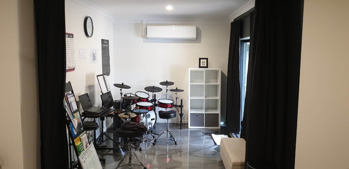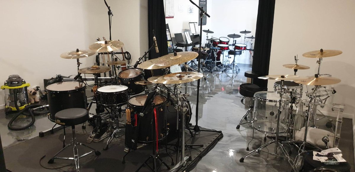 The smaller area (with red e-kit) is for teaching drums since I work from home, and the bigger area is set out as a hybrid room for both recording drums and mixing (as well as band practice, hence the PA and sub).