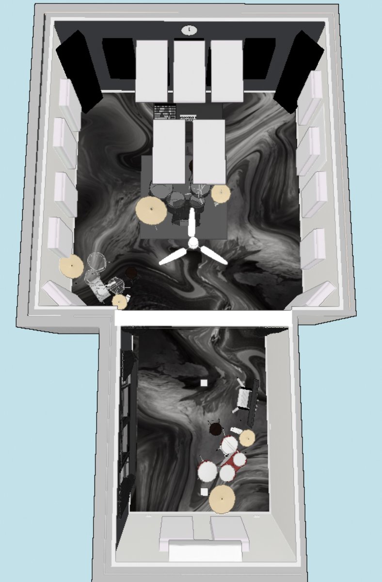 3. I have the recording kit right behind me at the mixing desk. I decided to go with placing the kit in the centre of the room based on the whole setup so far. The snare and floor tom(s) seem to sound good there. Is this a common occurrence to have it set up this way in a hybrid room? Does having the drums behind the mixing desk massively affect the mixing side of things by being a large diffusive/reflective object?