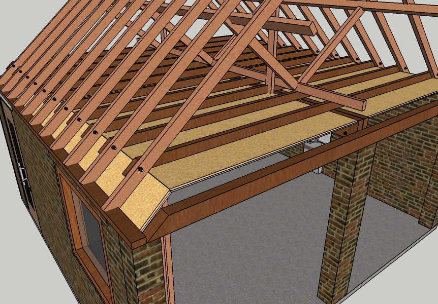 Stuart also suggested using 'inside out' modular panels for the inner leaf walls where possible as this will also increase the volume of the room and, if I understand this correctly, building the middle leaf ceiling below the existing rafters instead of above them to avoid the difficulty of building around the existing bracing.