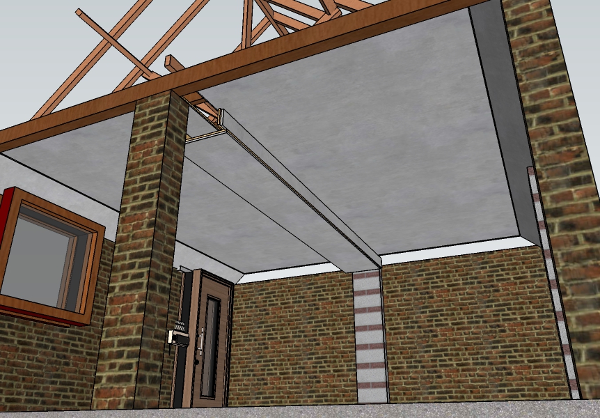 The frame will need to be reinforced on either side of the main beam with two steel 152x89x16mm universal beams in order to support the inner ceiling in a single span. These will need to be pre-drilled in order to attach the connecting timbers.