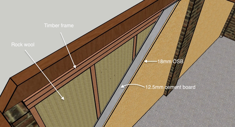 The inner leaf structure will be a conventional stud frame clad with one layer of 18mm OSB and one layer of 12.5mm cement fibre board with green ’glue’ in between to form the inner wall, anchored to the concrete floor with an air gap of at least 30 centimetres between the leaves, which will be loosely filled with rock wool.