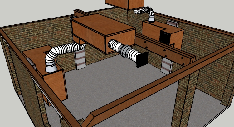 I've been working on re-designing the HVAC system for my studio design after some very helpful input from Stuart. This includes eliminating wasted space in the wall cavities between the inner and outer leaves and repositioning the inner leaf silencers to the ceiling so that, on the input side they guide airflow directly into the AC unit.