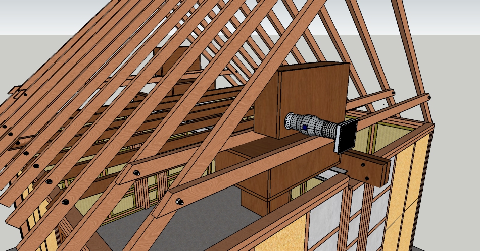It’s funny how long it takes for the blindingly obvious to occur (to me anyway) but the other big problem I faced with my first two designs was finding space for the inner leaf silencers. I intended to replace some of the ‘inside out’ ceiling modules I planned with the boxes but that would have meant lowering the (already low-ish) ceiling height in those parts of the room. Then it occurred to me that by raising the two joists nearest each gable by 20cm I could make plenty of space for them and simply contour the outer leaf around them.