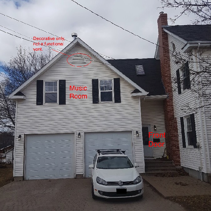 I have small music room on the second floor of an attached garage with a cathedral ceiling. It is adjacent to the master bedroom and adjacent to a partially finished workshop at the rear. The music room faces a busy street 39' in front, and faces two large apartment complexes 108' in front, across the street. The house is under a flight path, and has a railroad track approx. 600' behind the back yard. The approximate Dimensions: of the room are: Floor area 270.5"x182.5", knee wall height is 31.5", and the subfloor to bottom of central support beam 117.5"