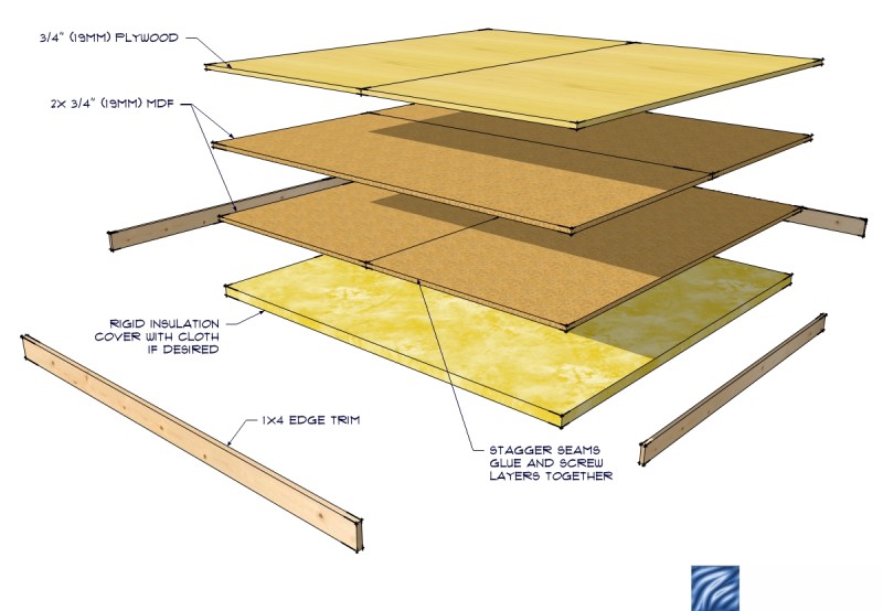 If I don't completely float a new floor assembly and go for a decoupled solution as in figures 10.16 and 10.19, my thinking is to add as much Gypcrete mass as possible, replace the two layers of 1/2" plywood with two layers of 3/4" MDF, and apply 2-3 tubes worth of Green Glue (per 4'x8' area) between all solid faces. The entire studio floor would essentially resemble the Glenn Drum Riser design sitting on top of Gypcrete.