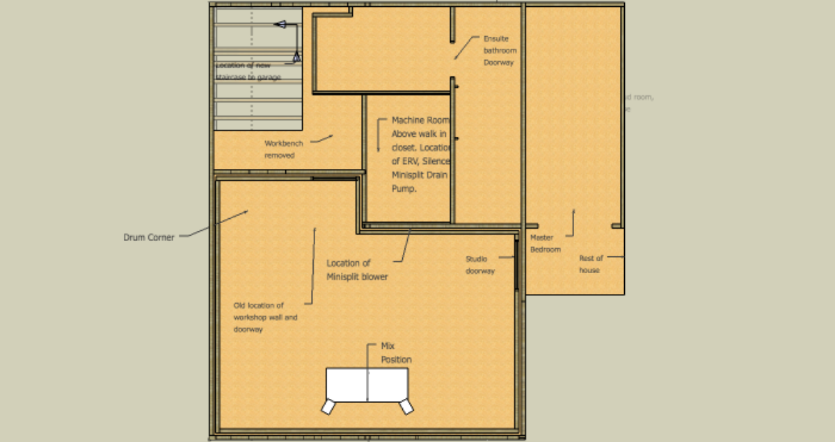 The engineer that did the structural evaluation also designed a stair case leading to and from that garage in what was the workshop area. My contractor is looking at those stairs this week. Given code requirements for these stairs, I'm now looking at how to best use the remaining floor space in the workshop area. One option would be to move the wall between the workshop and studio back to allow just enough space for the code required landing at the top of the stairs. This would give me a bit more space at the drum corner.