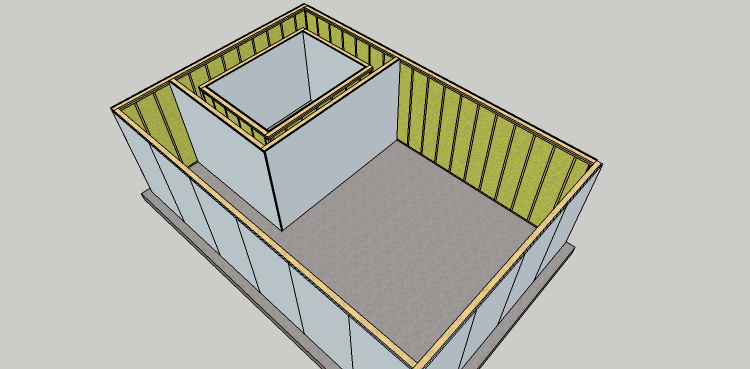 Right! More hands on deck can really help to make things go faster, especially with the pre-fab guys just wanted to unload the truck, slap things in place, and get out of there fast. So it's good to give them a heads-up that you'll have people there to squirt down the caulk beads under the sole plates: they'll need to take that into account in their timing. And do yourself a big favor here; get a compressor and pneumatic caulking guns for this! It goes way faster, and the result is better and cleaner. Save your hands... squeezing a manual caulking gun all day will wreck your wrists! Renting a compressor and buying some hoses and a couple of guns is well worth the investment. Or even buy your own compressor, then sell it again when you have completed the studio to recover most of the money You'll find LOTS of uses for a compressor while building a studio...Since I will be up to my eyeballs in caulk with the beefing of the exterior walls and ceiling, I think I'll pay to have someone else do the first bit, if it's an option.
