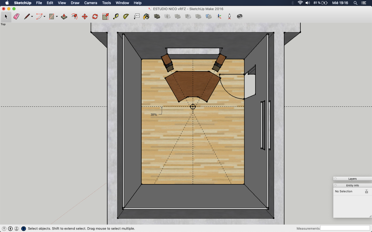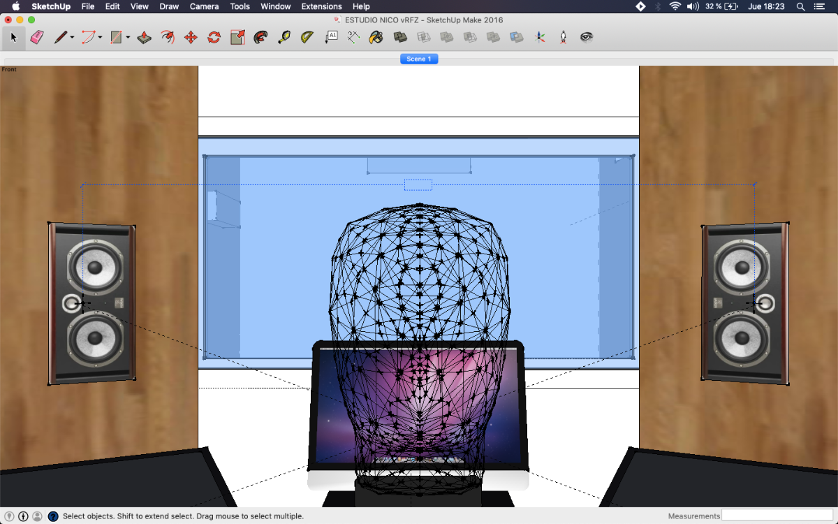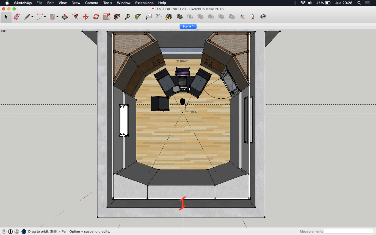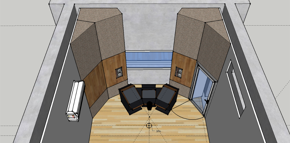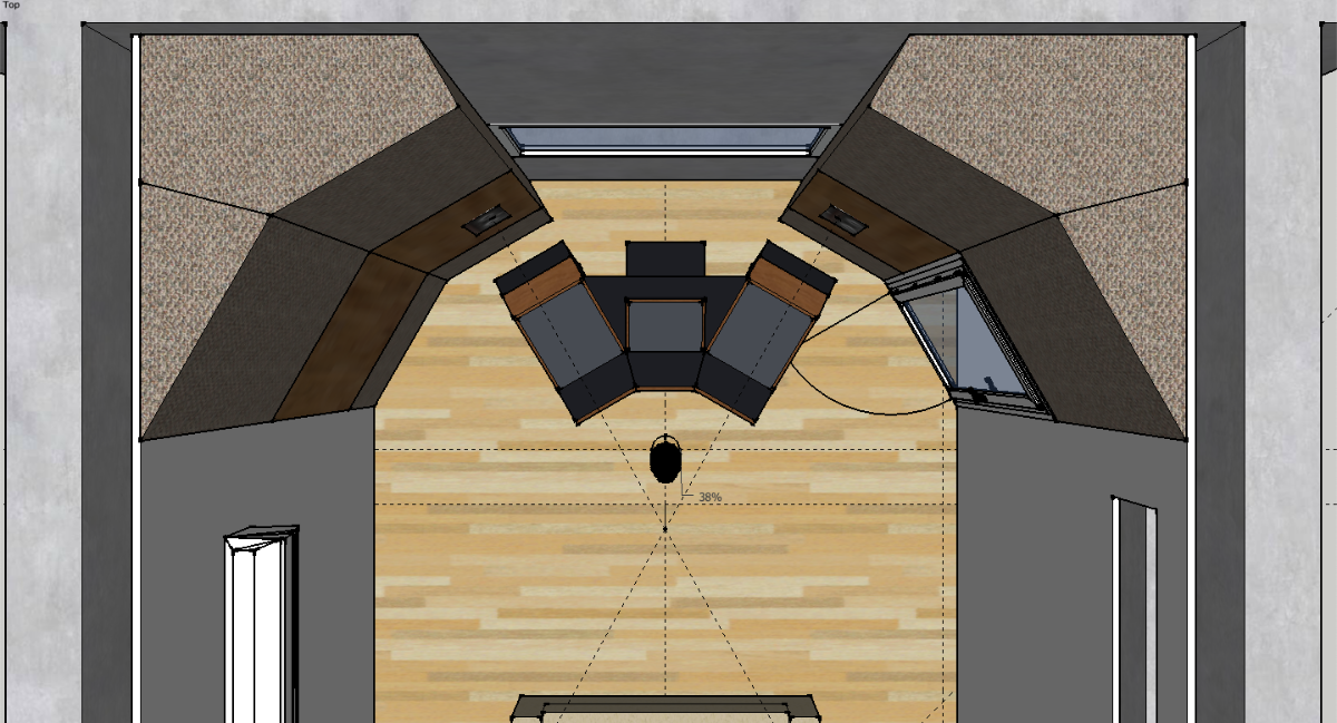 It's probably a bit wider than it should be, but I'm betting there is a way to narrow that down a bit, with careful soffit design. Playing with the angles, dimensions, and locations is part of the "art"here, to optimize them. One key aspect is to ensure that the acoustic axis of the each speaker points just past the tip of your ear, and the two axes meet at a point about 16" behind your head (give or take a few inches). That gives the best psycho-acoustic setup for your ears. Of course, checking that there are no reflections is also very important! I'm not sure if you've seen the tool I released for that: https://digistar.cl/Forum/viewtopic.php?f=9&t=2 You can use it inside SketchUp, attached to the front face of the speaker at the location of the acoustic axis. It helps you to see where the reflections might be going, in both horizontal and vertical directions.- As I posted in the layout with soffits, the separation between monitors is 2.34 m. Do you think it's ok? Isn't it a little bit large?