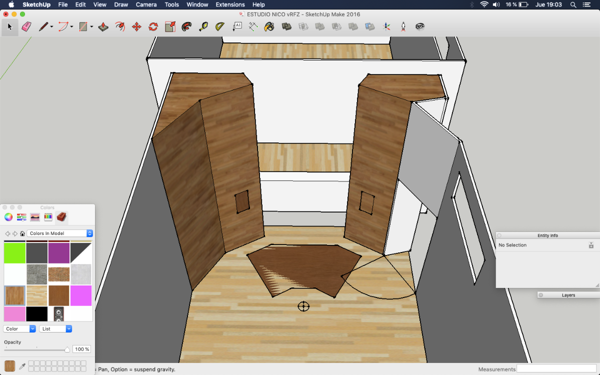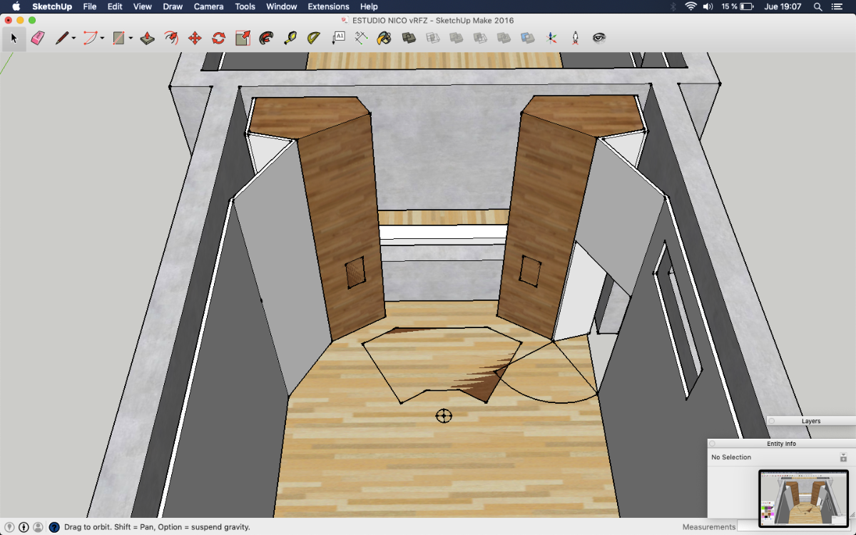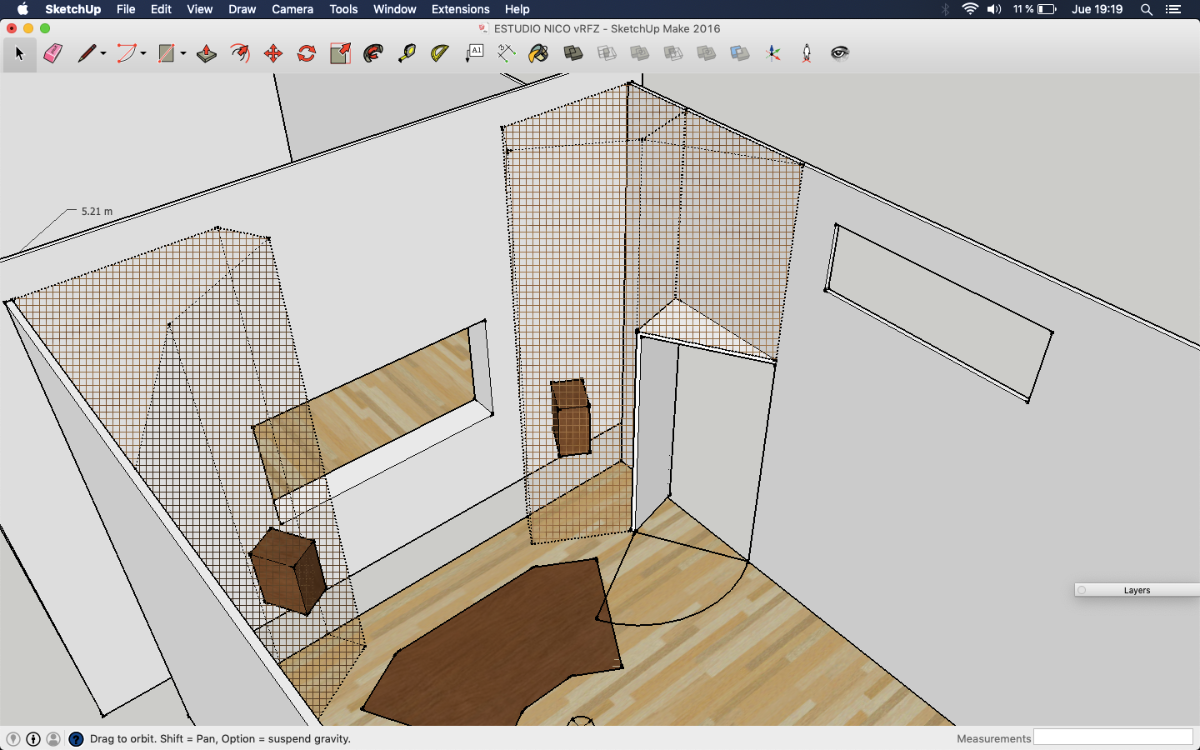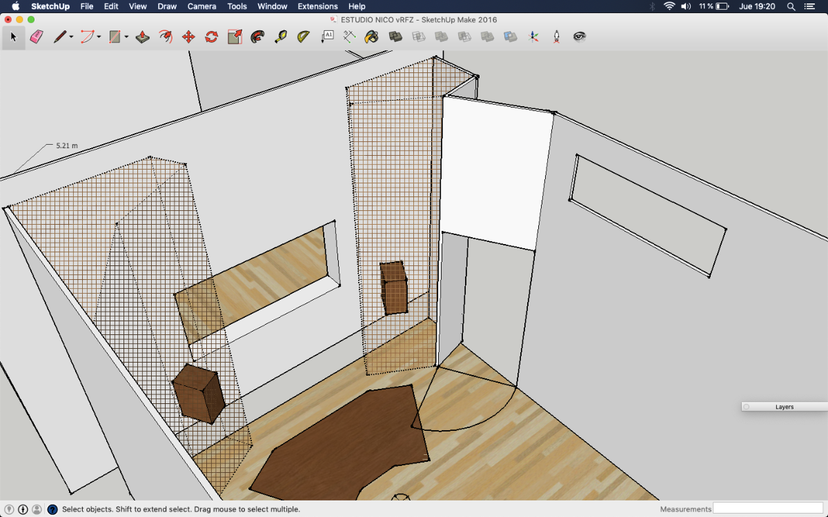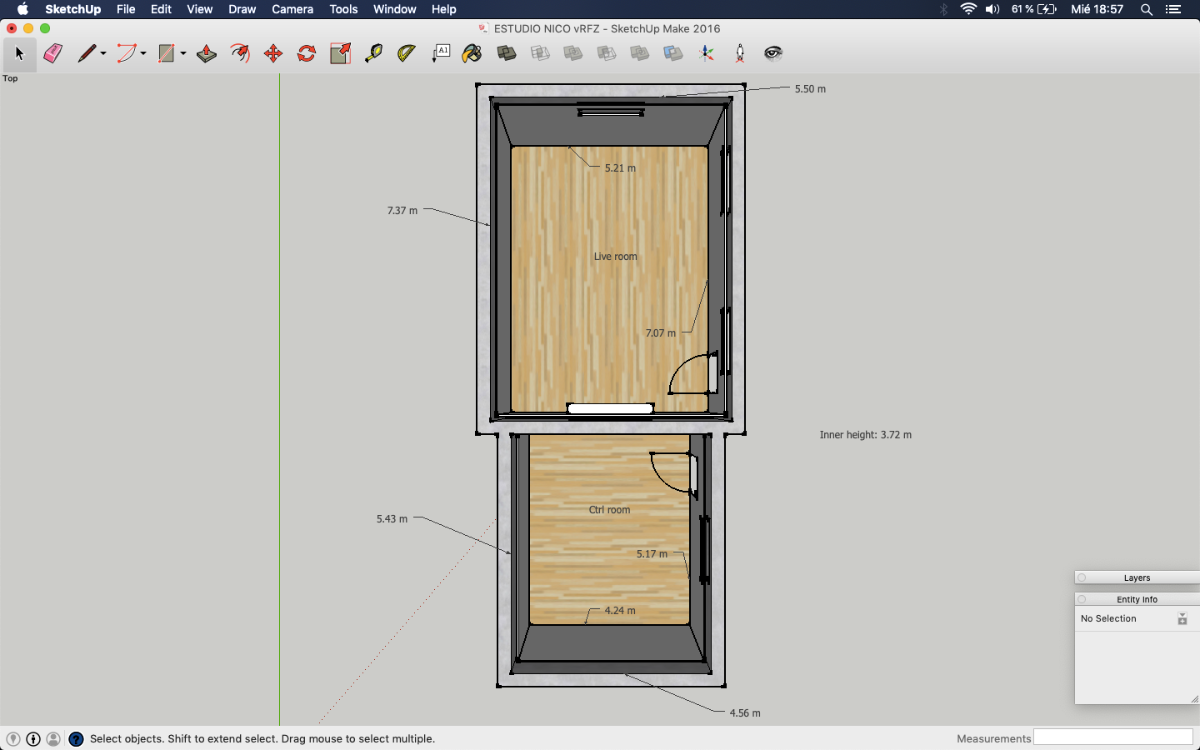 It's probably a bit wider than it should be, but I'm betting there is a way to narrow that down a bit, with careful soffit design. Playing with the angles, dimensions, and locations is part of the "art"here, to optimize them. One key aspect is to ensure that the acoustic axis of the each speaker points just past the tip of your ear, and the two axes meet at a point about 16" behind your head (give or take a few inches). That gives the best psycho-acoustic setup for your ears. Of course, checking that there are no reflections is also very important! I'm not sure if you've seen the tool I released for that: https://digistar.cl/Forum/viewtopic.php?f=9&t=2 You can use it inside SketchUp, attached to the front face of the speaker at the location of the acoustic axis. It helps you to see where the reflections might be going, in both horizontal and vertical directions.- As I posted in the layout with soffits, the separation between monitors is 2.34 m. Do you think it's ok? Isn't it a little bit large?