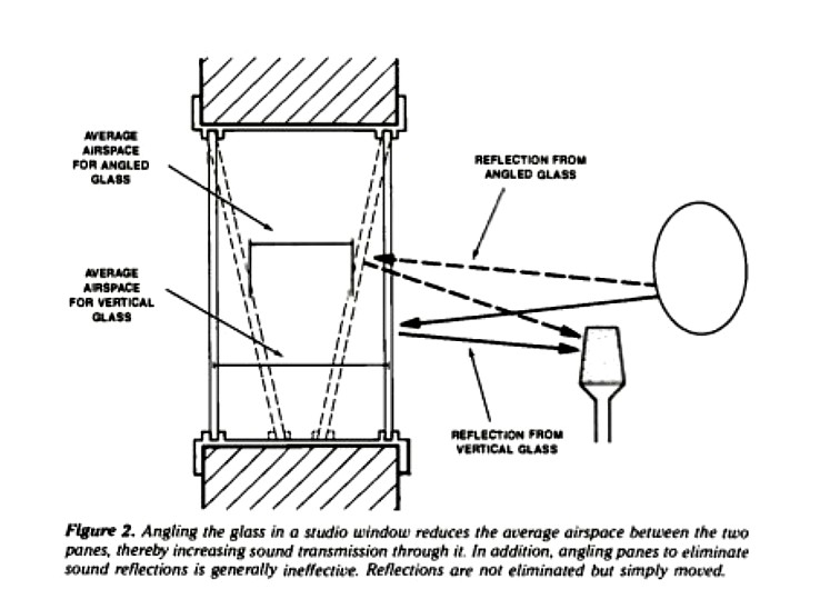 There's no acoustic advantage at all, and in fat it can reduce the isolation between the rooms (make it worse): Just keep the two panes parallel, and with plenty of porous absorption around the cavity perimeter.- Since the window between control and live room is located in our control room's front wall, right behind the monitors, are there any advantages tilting it up by 12º? (it's the maximum angle the wall's thick allows me).