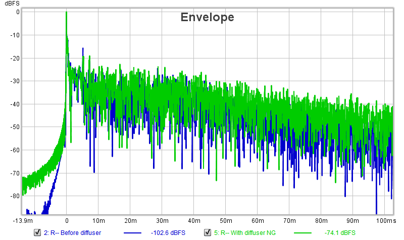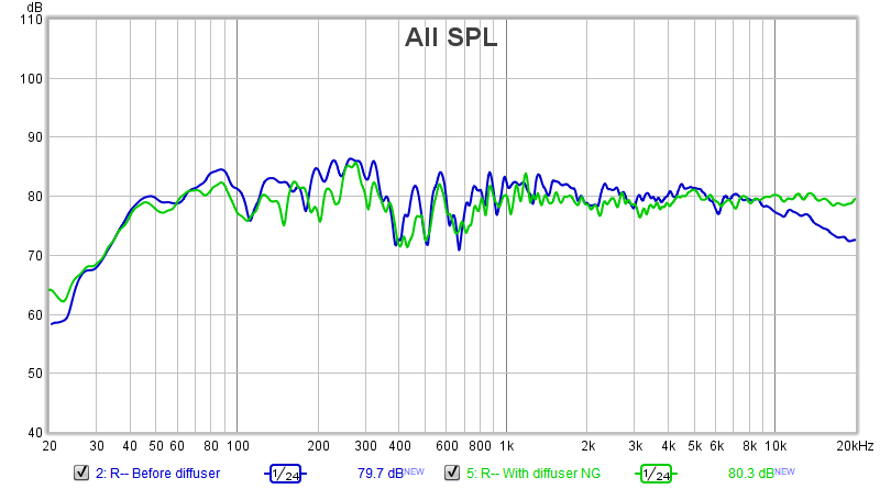 And some "before / after" acoustic test results for that same room: You can clearly see the nice effect it has on smoothing things out. The client was very impressed with the actual listening tests he did in there, right after installing the diffuser. That was several months ago, and things have advanced quite a bit since then: we are getting close to completing that room, and he has promised to do a thread on it, here on the forum, as soon as he can.