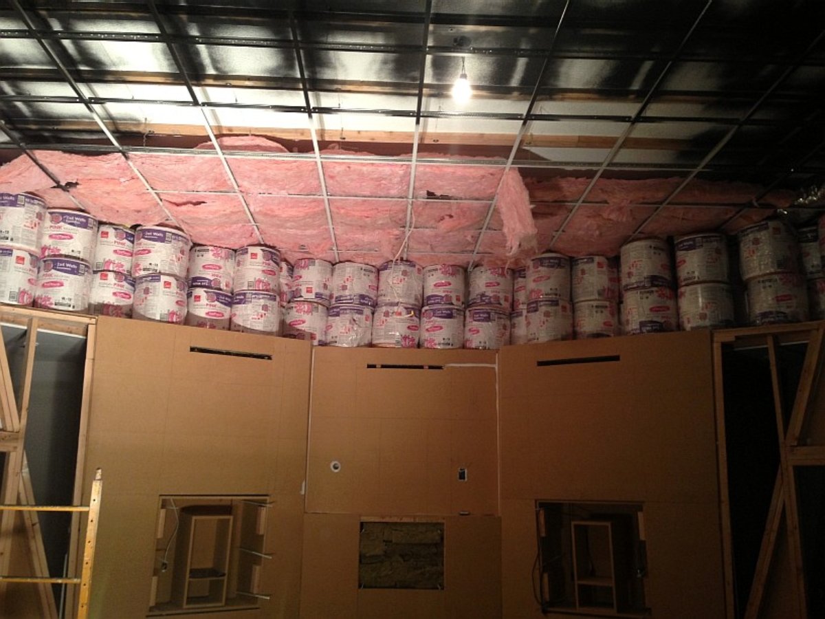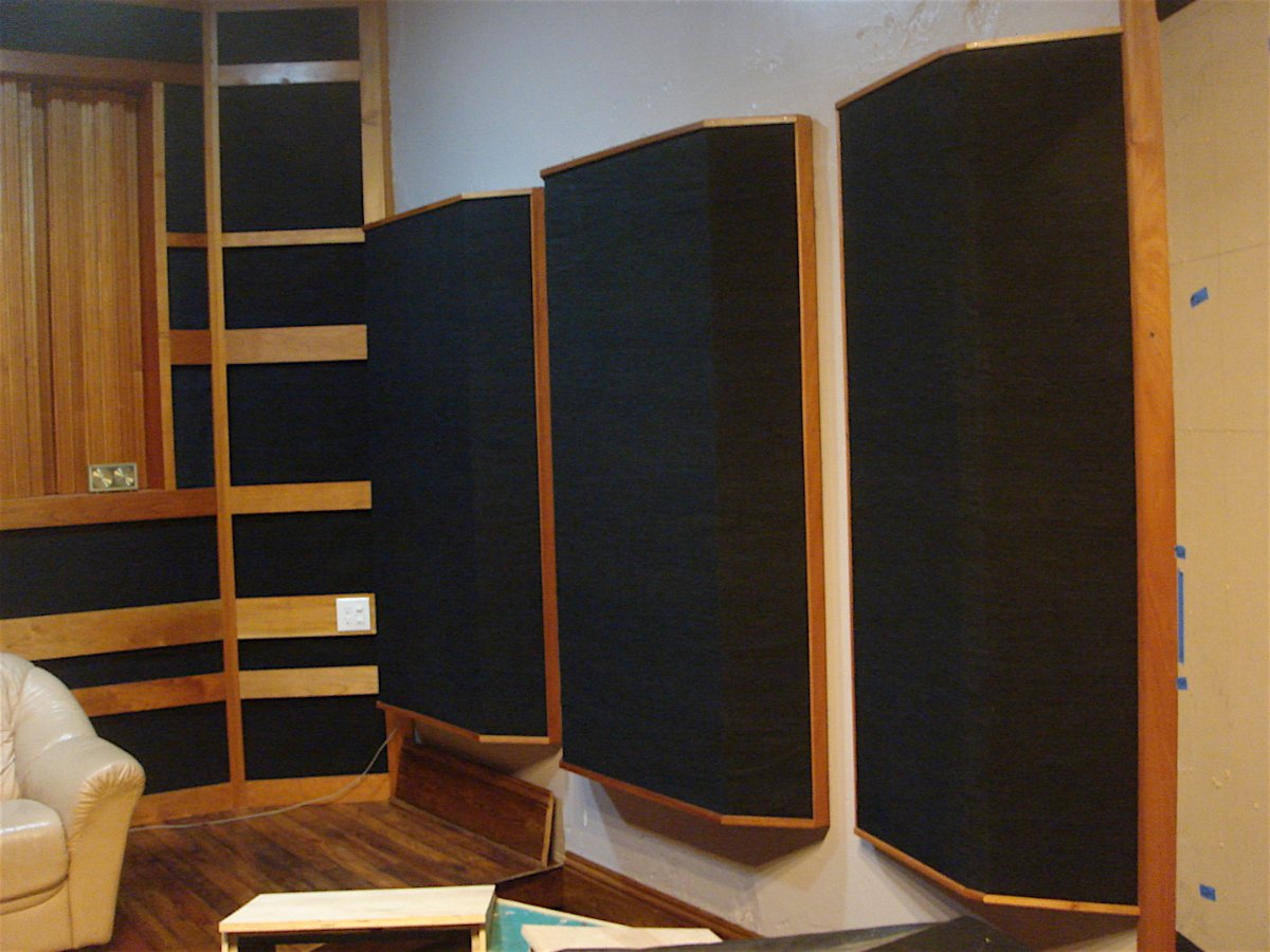 You probably won't be able to get exactly those results, because that room is much bigger than yours, and there's a HUGE amount of treatment in there, but you can still get very good results in your room. Here's another construction photo, from the early days, showing the very large amount of porous absorption that went in, above the front of the room.