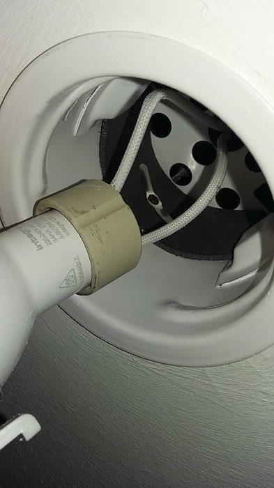 The downlight fitting is pretty massive, made from thick metal and fits flush to the plasterboard ceiling with a proper gasket. a couple of clips grip the drywall from the side, and two springs above hold it in place vertically;