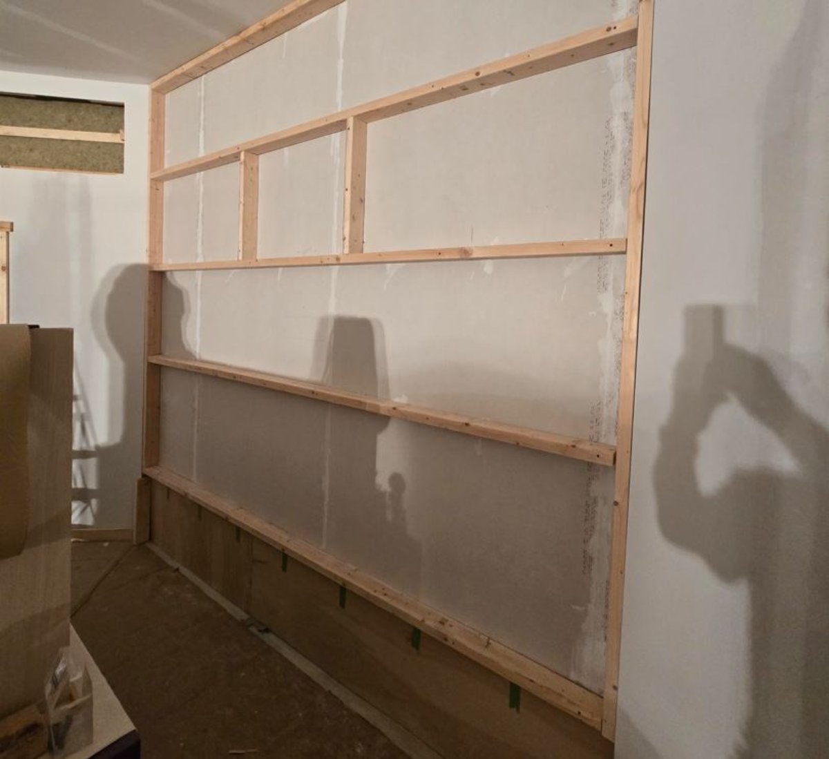 - Built the 2x4 frame for the back wall (this wall will be filled with 3.5-inch Rockwool, covered with black fabric and vertical slats, and will house the 85-inch TV). The horizontal 2x4s are screwed into the furring strips beneath the two layers of drywall. However, for the two vertical pieces supporting the TV, we drilled three holes halfway through the 2x4 and used 6" screws to reach the 2x6 stud. We also placed a screw at the top and bottom of each piece.