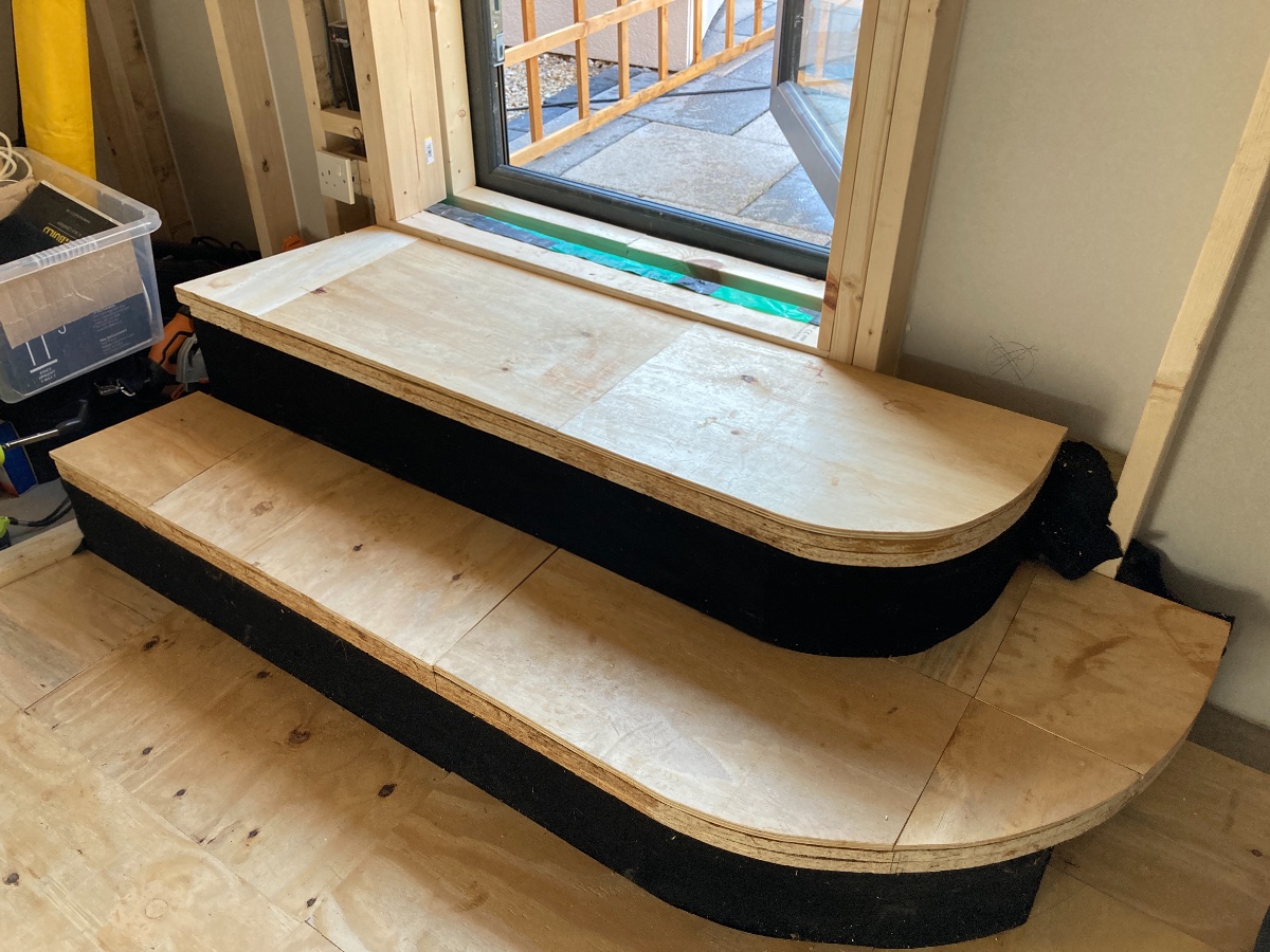 Since then in evenings I cut and glued down the plywood floor onto my ‘step trap’, trying to follow the grid pattern from the floor. There were two curved pieces that I had to cut twice because they weren’t good enough first time and I’m glad I kicked my own ass into doing that rather than an “it’ll be alright” attitude. This means that the floor is ready for sanding and varnishing but that can wait.