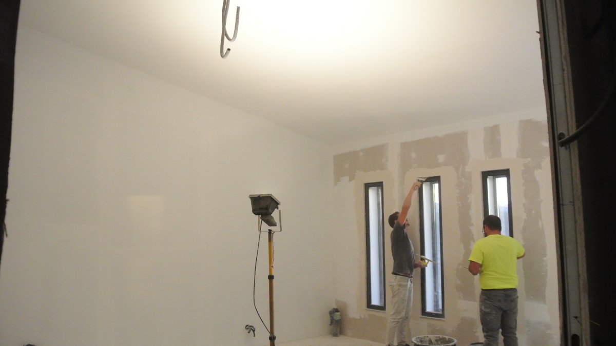 They worked more on the outside of the building as well as the window and door frame plastering. Only one more layer of materials on the sides of the building and then they are ready to paint. They still need to do the pointing on the granite stone on both sides, Outside of the building is nearly complete. Tom managed to paint all the ceilings and walls inside today and it looks great. Only needs to be painted around the windows and door where they were still doing plaster work.