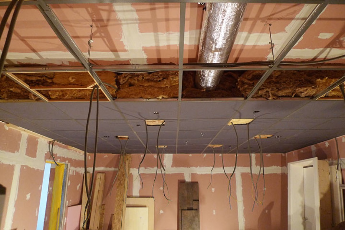 And here you can see 6 large square holes for where lights will go, plus the insulation above the tiles, which, incidentally, has changed the sound in the room quite dramatically.