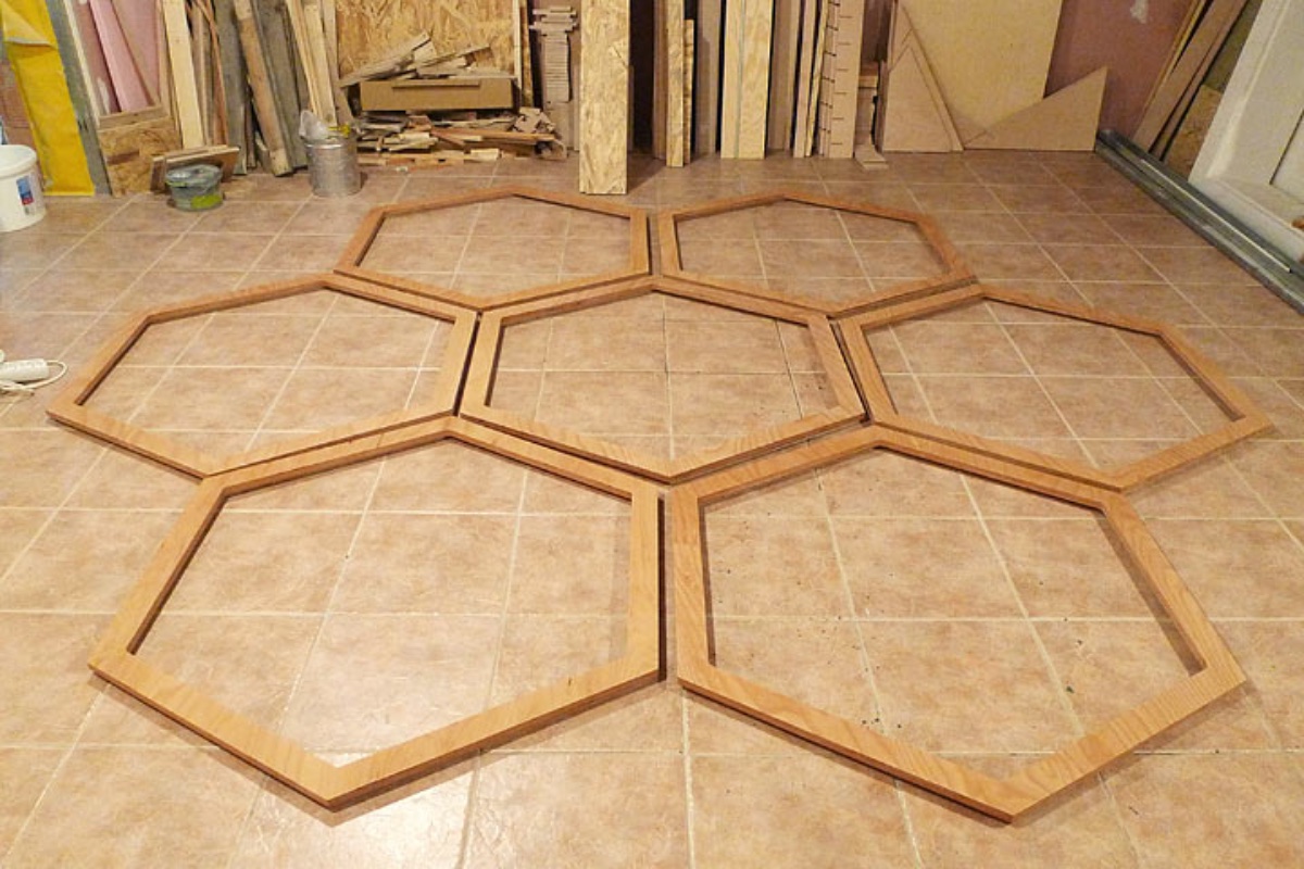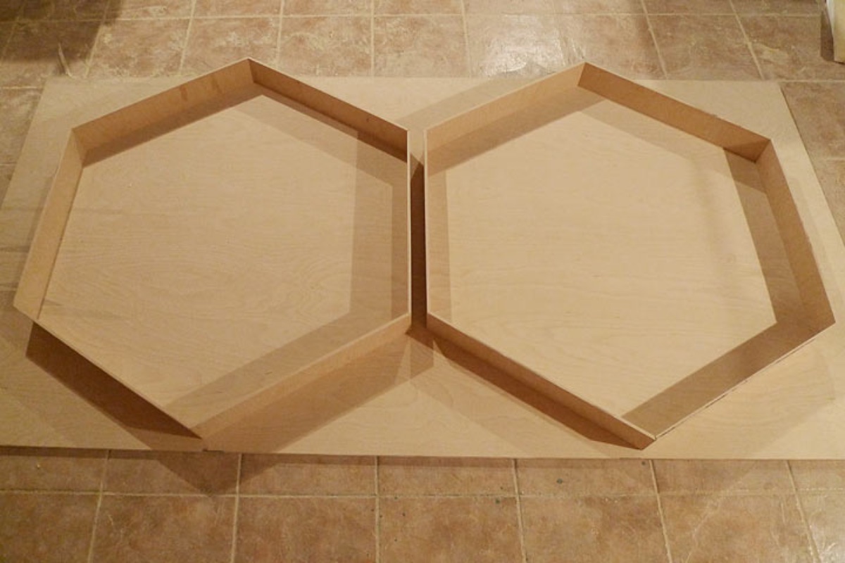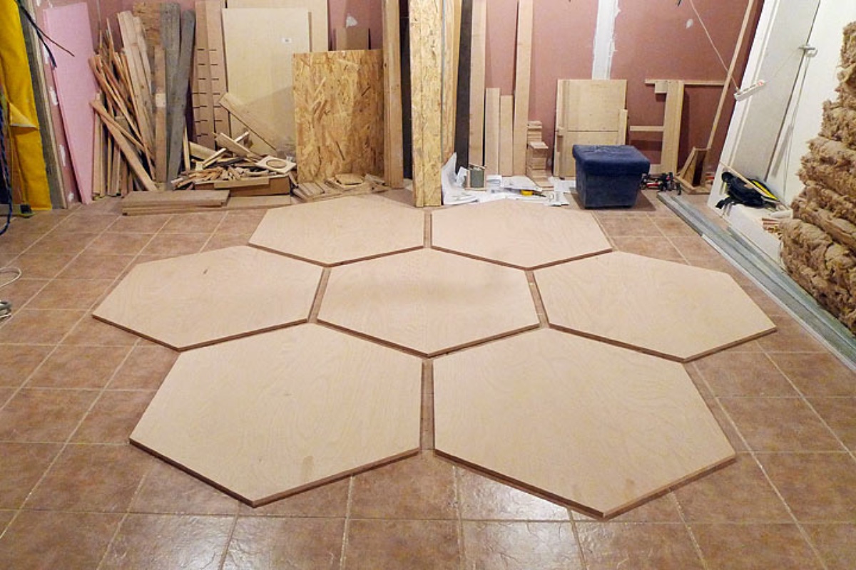 The next job will be the hexagons toward the rear of the room. Yesterday I cut out seven plywood hexagons.