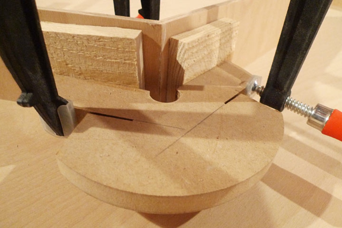 In order to hold the 120 degree corners while the glue dried I had to come up with some clamping devices from scrap wood.