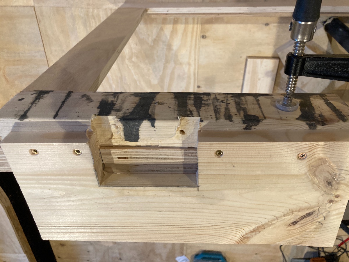 The jig worked fairly well although I still needed to mess around a little on each hole afterwards. When I finally hung the door I discovered I’d cut the holes for the hinges a bit too deep, so the door won’t actually shut. I think I can fix this with some shims to pack the hinges away from the frame a little. Luckily I have some spare 1mm thick neoprene that was used for shimming the windows.