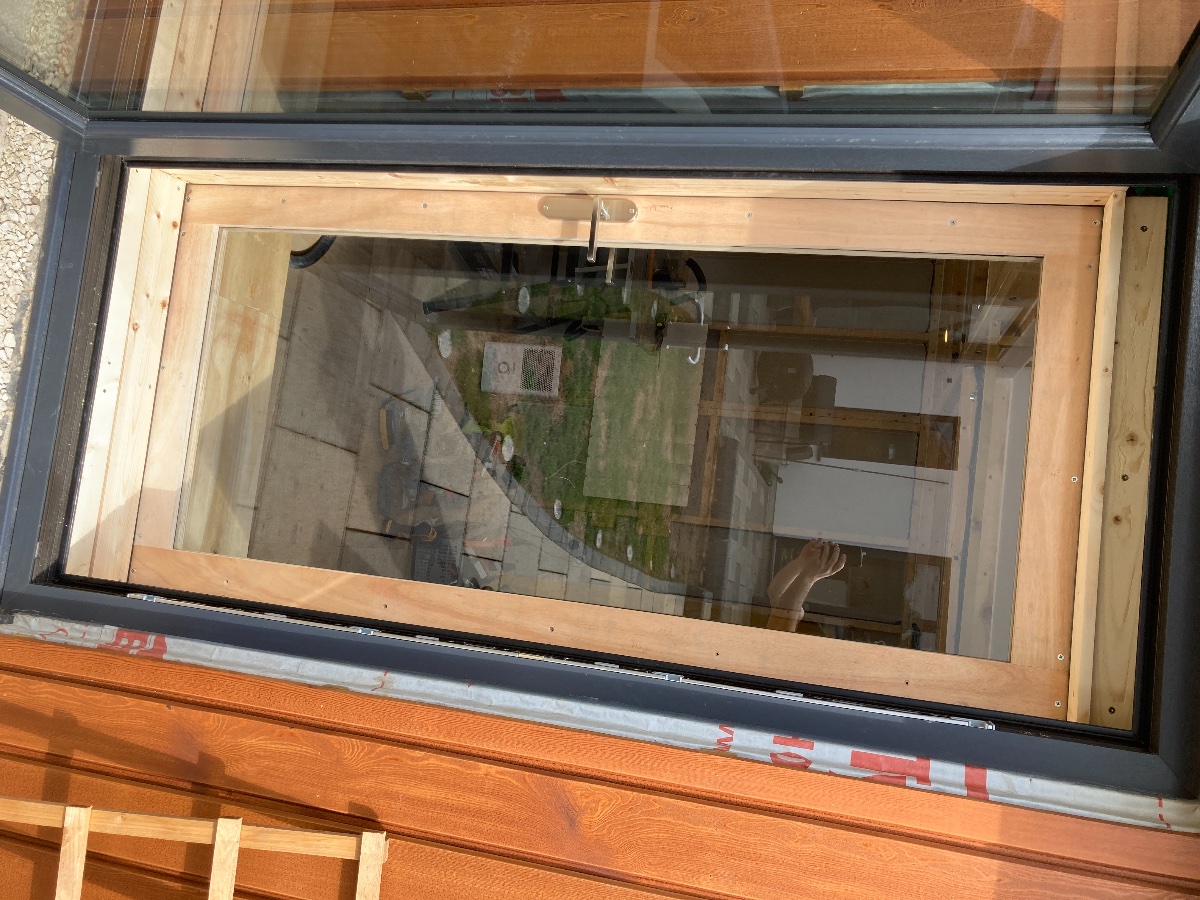 Finally, I took the door back on to the floor, stuck glazing tape to it and then my partner and I carefully dropped the glass into the door. We had to lift it back up to get it square which was a right pain due to the glazing tape, but hopefully we got away with it. I then silicon sealed the gaps between the glass and the wood, and left it to dry.