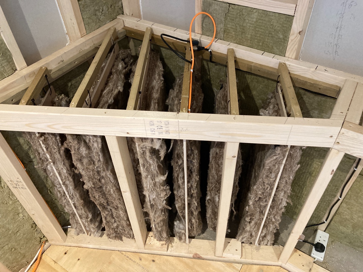 I have managed to make the hangers for under the left side soffit shelf and put some of the framing in for the shelf above the soffit front. I also filled the stud bays under the soffit shelf with Rockwool RWA45 and cable clipped power and xlr cables for the monitors to the framing.