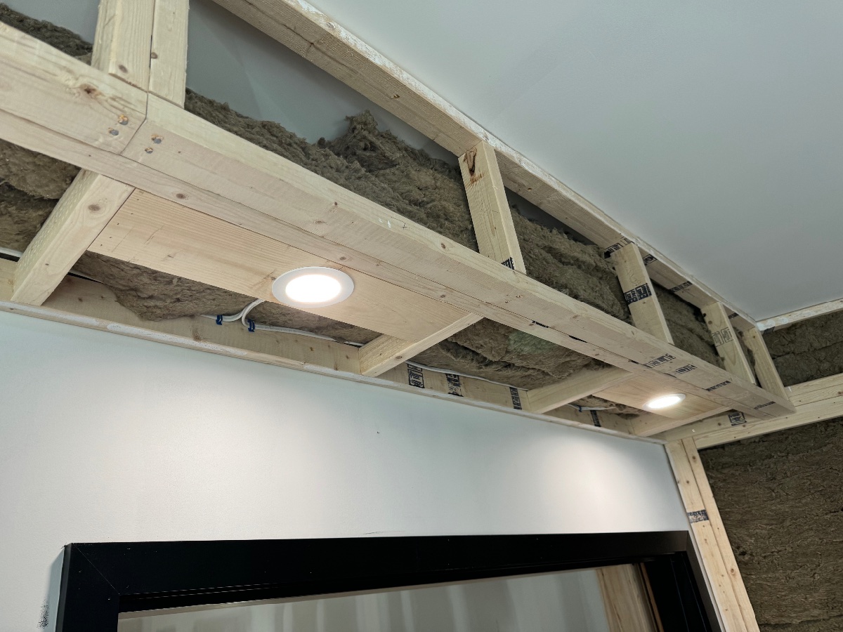 The soffits are all framed up and the electrical is run for the puck lighting. I’m stuffing them now as you can see. It’s just very itchy work and takes quite a bit of time. These are the super chunk style traps in the front, there will be similar in the rear of the room.