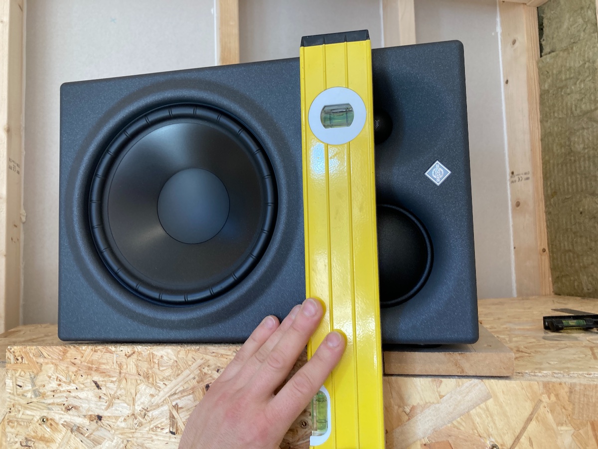 - I used the spirit level to line up the acoustic centre of the speaker (according to what a very helpful tech support person from Neumann’s UK distributor told me) with the previously marked correct location