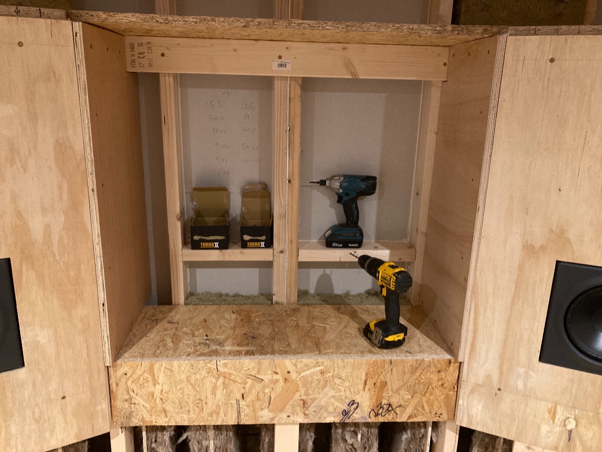 Edit.. made the hole bigger so it doesn’t touch the speakers and finished the second front. Also doubled lined/layered the cupboard between the speakers. No idea if this will become a resonant box but I read Stuart say somewhere that a cupboard between the speakers is doable so thought I’d do it! Will make double thickness cupboard doors tomorrow. Once that’s done I should be able to think about another REW test, but I might try cutting wood for my desk furniture first so I can then throw away all the offcuts and clear the room.