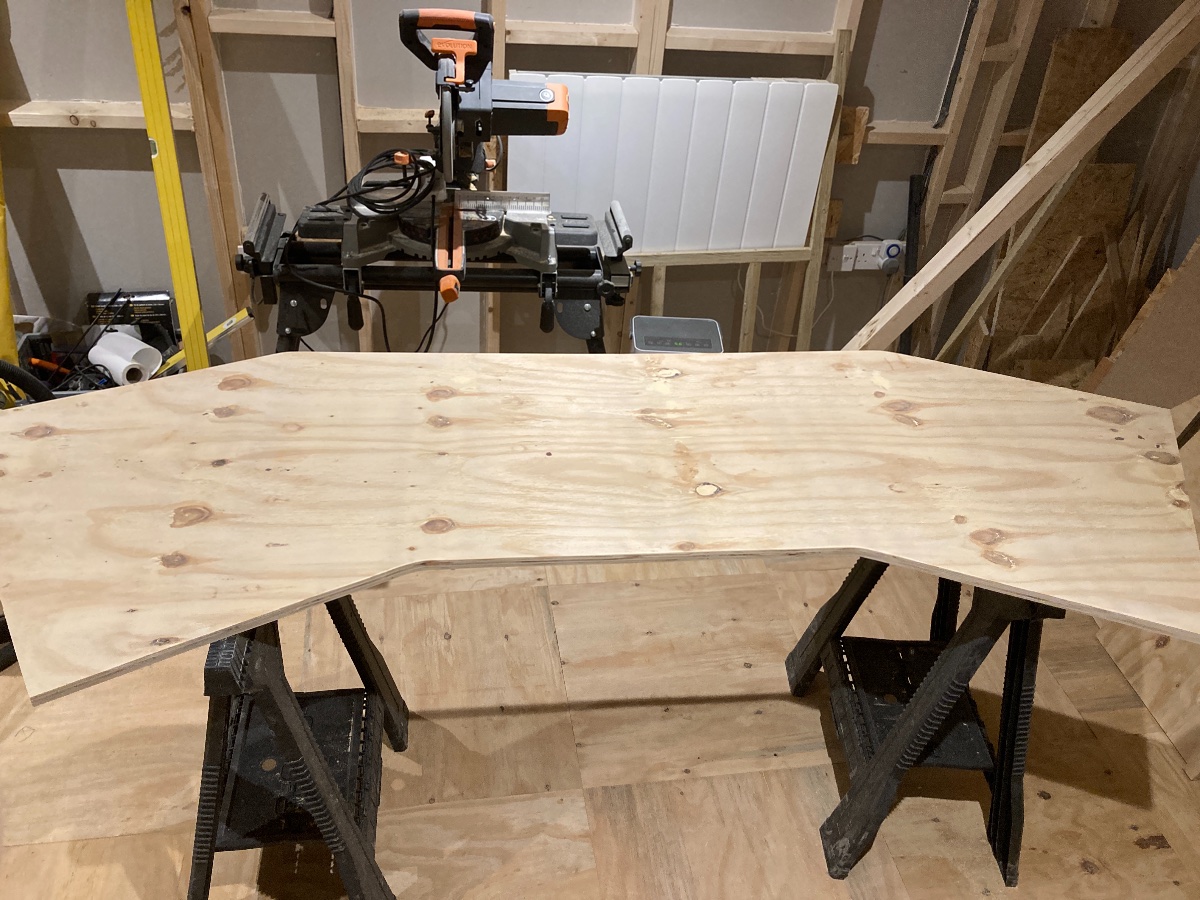 I also cut the top for my desk. My design is based on Stuart’s low profile desk, although smaller and less fancy. It will have 4u of rack space each side on the top, at a shallow angle and 4u of rack space underneath on each side as well as a drawer, I think. Again I’m making it out of cheap softwood ply for now and will likely replace it with a birch ply version in the future. So in a sense this is a draft version of the desk. My screen will be mounted off the back of the desk, low down and angled up to get and minimise it getting in the way of sound from the speakers.