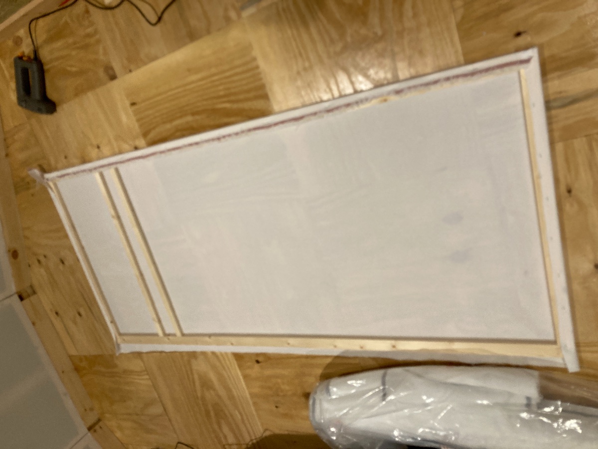 However this is a pain to install, and I’ve only managed to make one more today. My new staple gun was getting jammed (think I had wrong size staples) and then when I cut the material for the mains sockets to come through I managed to cut a bit too low, and also of course the material looses it’s taughtness around the socket hole.