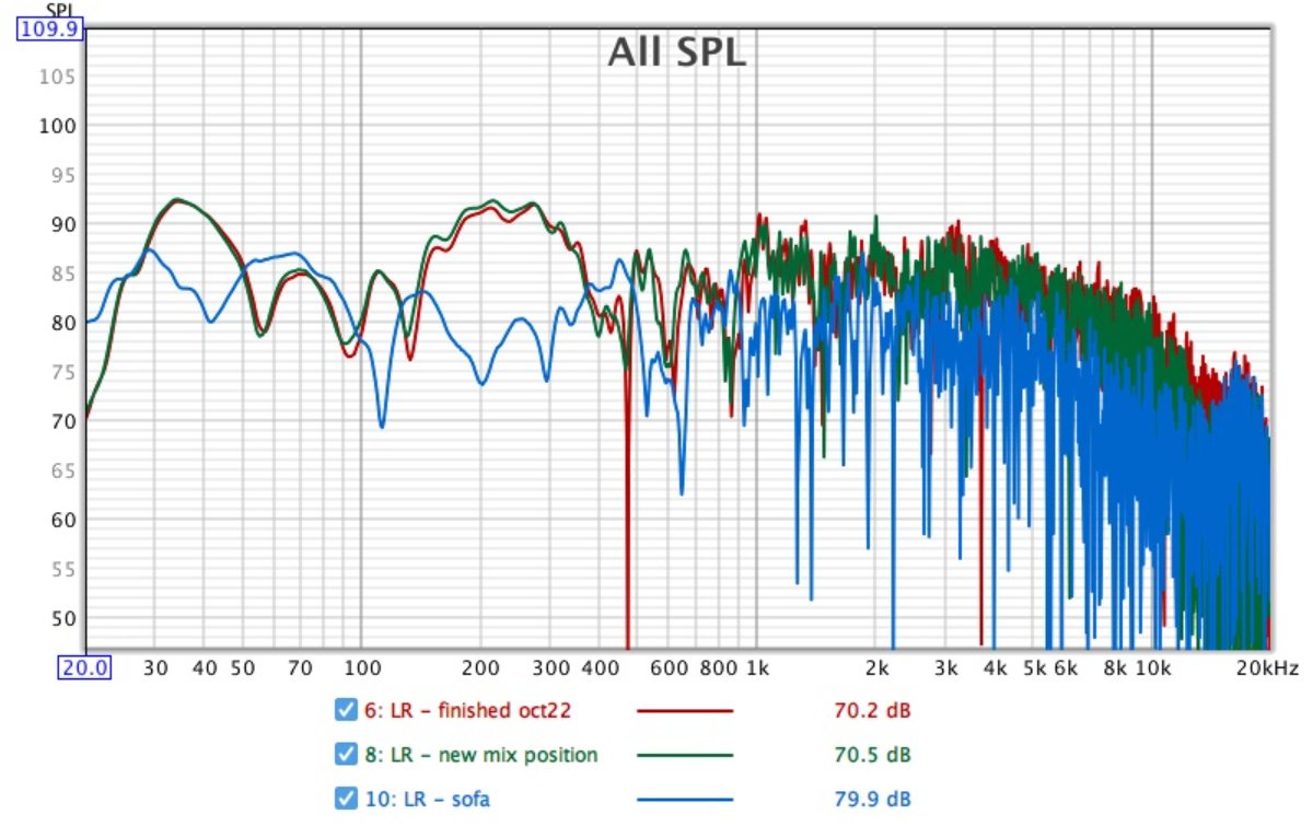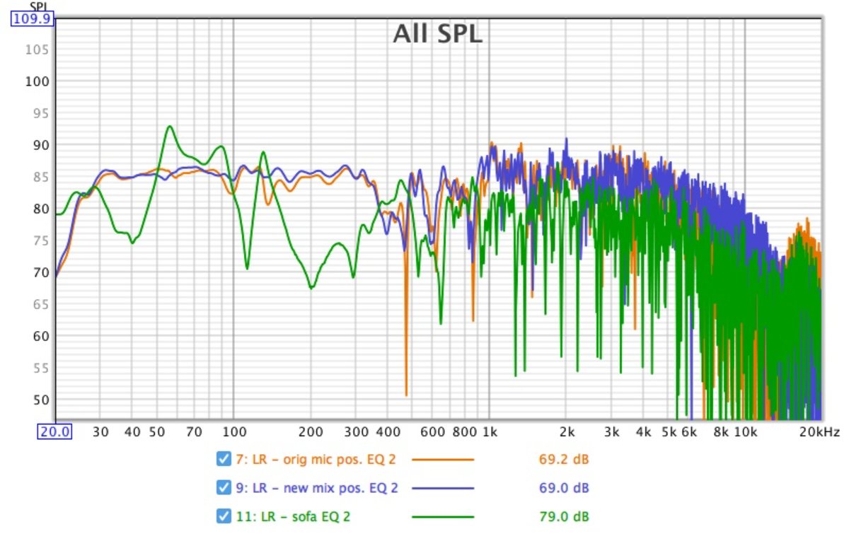 The 10dB higher for the sofa - are you looking at the bottom graph (green line)? In which case, this is the sofa position with the FBQ filters engaged. There are some high peaks compared to the other positions and I'm assuming this demonstrates why boosting EQ to 'fix' a null at one position can cause issues elsewhere (the FBQ had peaks of +9dB at 90 and 130).