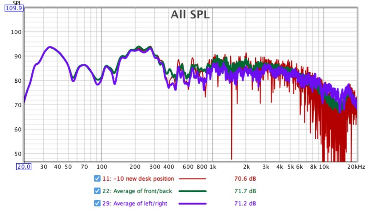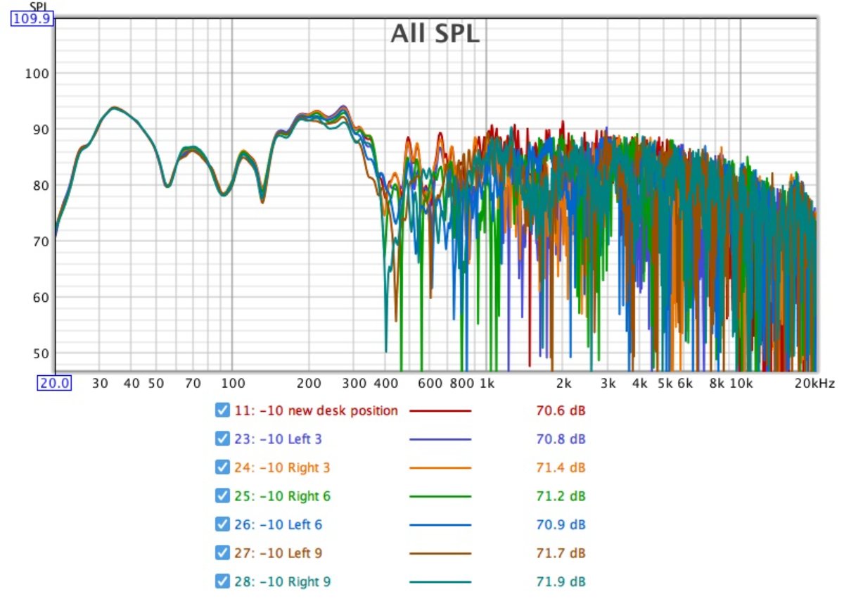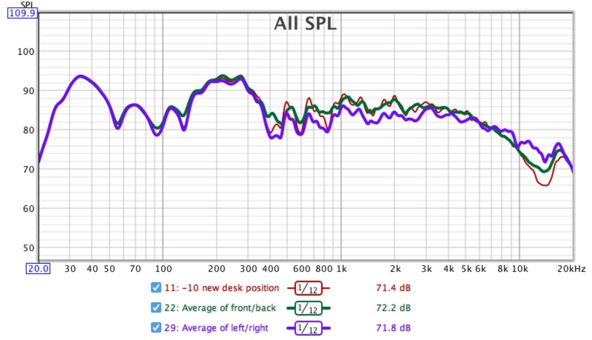 Having put the desk back, I then moved the desk and mic quite far forward towards the speakers, and started working backwards, moving the desk and mic around 1" at a time. As the purpose was not to find the best position for the desk I didn't measure this perfectly.