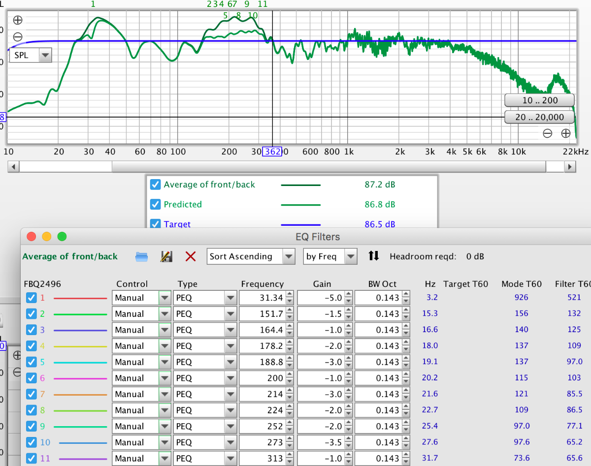 The REW EQ settings pane is really interesting.. sat on the sofa rather than in the studio I've played with filter settings compared with the front/back average measurement(s). I started with the room modes as identified by the Bob Golds calculator: