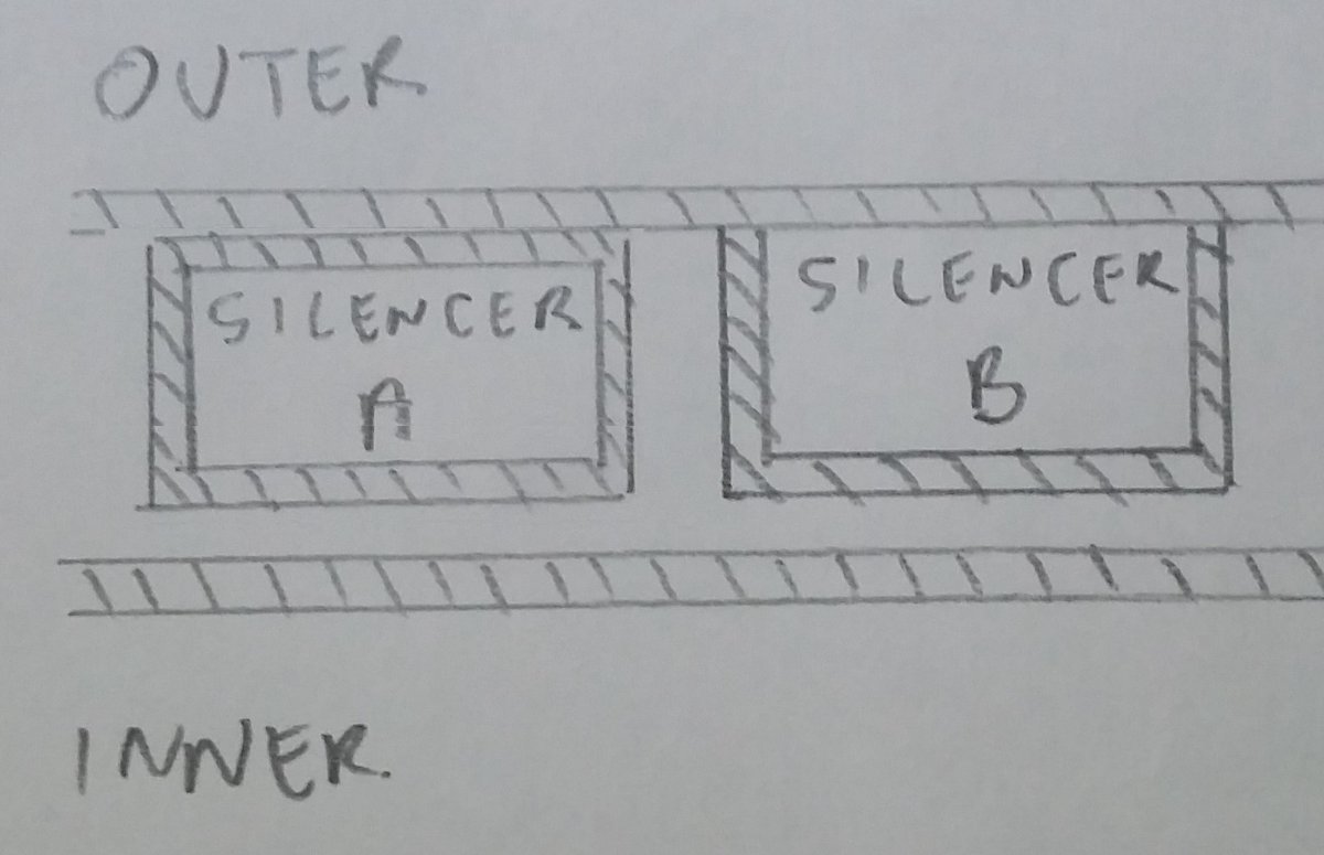 One way of increasing the cross section is to use the leaf of the building as one of the silencer walls. Starlight did this for one of his silencers, and you can see that in his build thread. The standard arrangement is represented by silencer A. But since this is for the outer leaf, we can just attach it directly to the leaf, meaning one side less is required. This will allow a larger internal cross section.