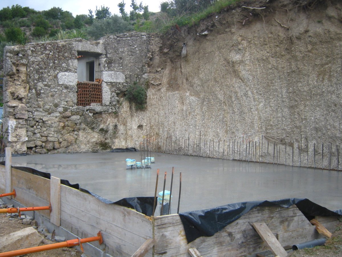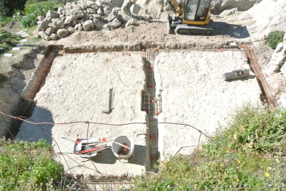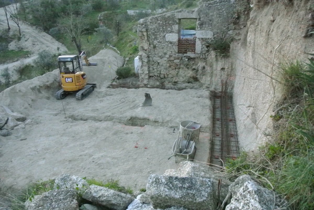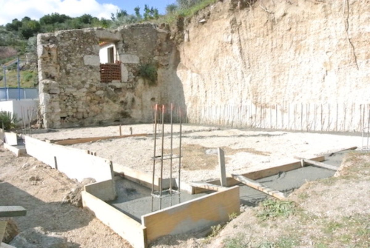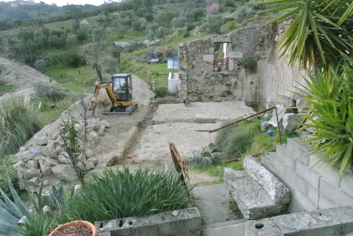Great weather and Paul and his two helpers did a great job today. The corner of the ruin was cut off, the foundations for that side of the building cut dug out, the kiwi transplanted, the steel cages for the rear foundation put in place.. Looking good… I took a lot of pictures.